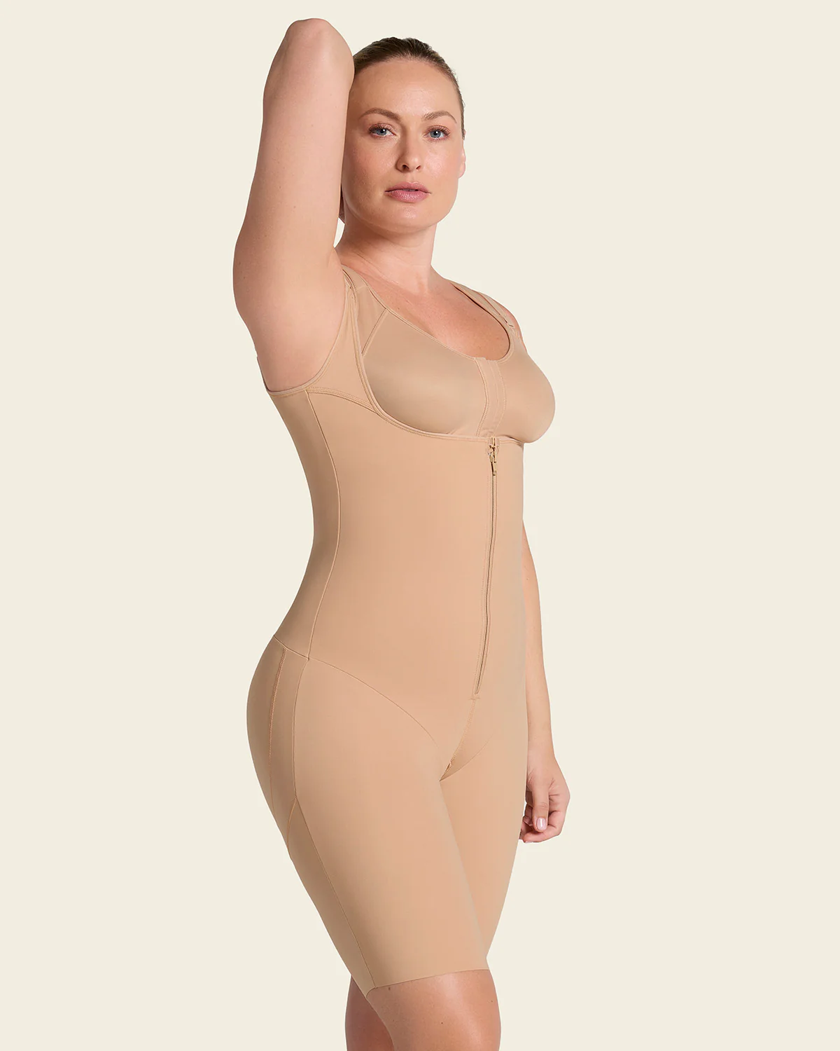 A full-coverage post-surgical garment made of soft flex fabric. In the torso is an ultra-soft and light layer of our signature PowerSlim® fabric for firm compression to help with healing. The mid-thigh short bottom provides moderate compression and there are no seams or elasticated leg bands at the bottom, providing superior flexibility and comfort. Special bands in the back for support. A fabric-lined front hook-and-zip closure allows comfortable and easy wear.
